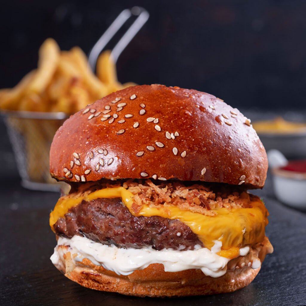 Trüf Mayonezli Burger (Yeni) İçindekiler:Kömür Ateşinde Dana Burger Köftesi, Trüflü Mayonez, Çıtır Soğan Parçacıkları, Cheddar Peyniri ve Patates Kızartması ile.