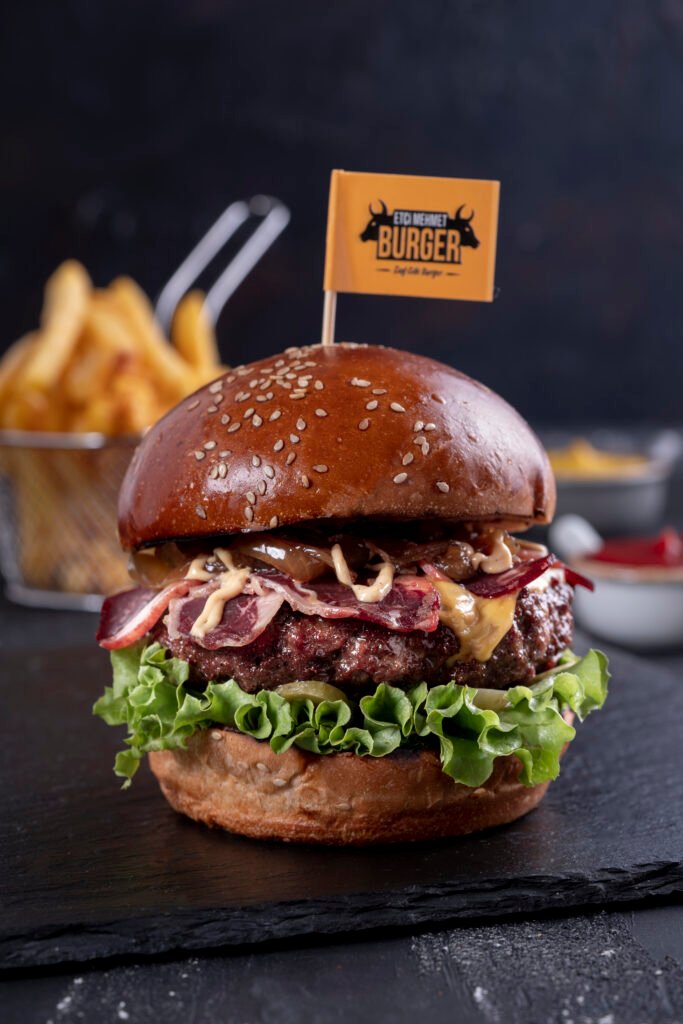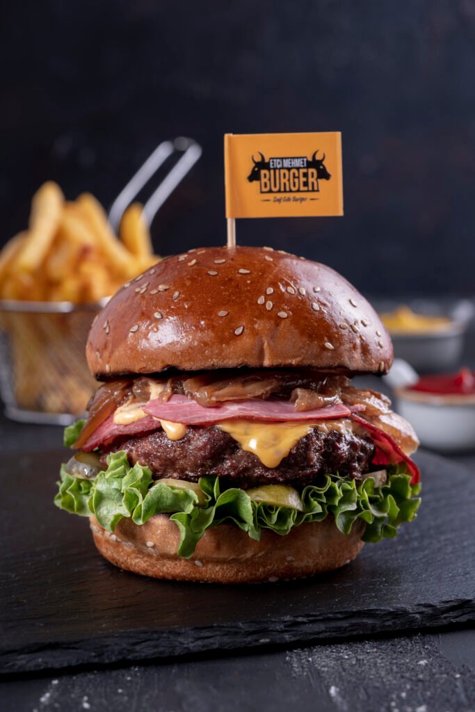 Etçi Mehmet Burger İçindekiler:Dana burger köftesi, dana füme, pastırma, istiridye mantari, cheddar peyniri, karamelize soğan, turşu,yeşillik, etçi mehmet özel sos ve patates kızartması ile.