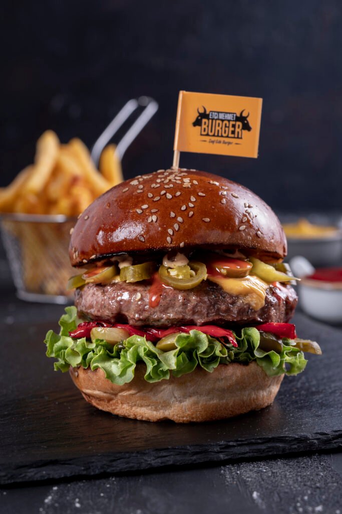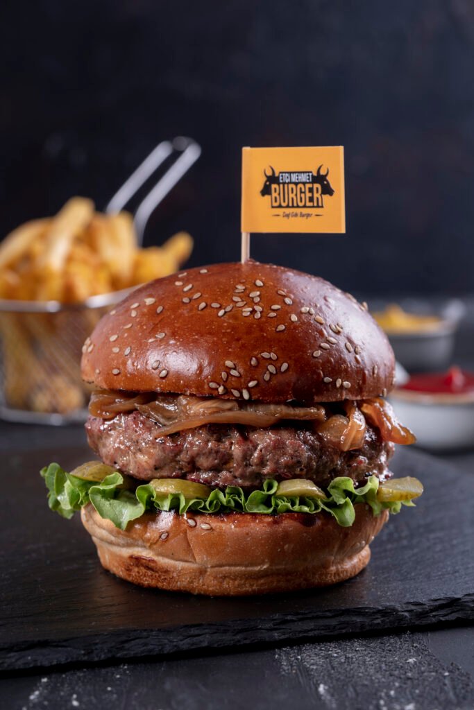 Mexican Burger İçindekiler:Dana burger köftesi, jalapeno biber, közlenmiş kırmızı biber, cheddar peyniri, karamelize soğan, turşu,yeşillik,acı sos, etçi mehmet özel sos ve patates kızartması ile.