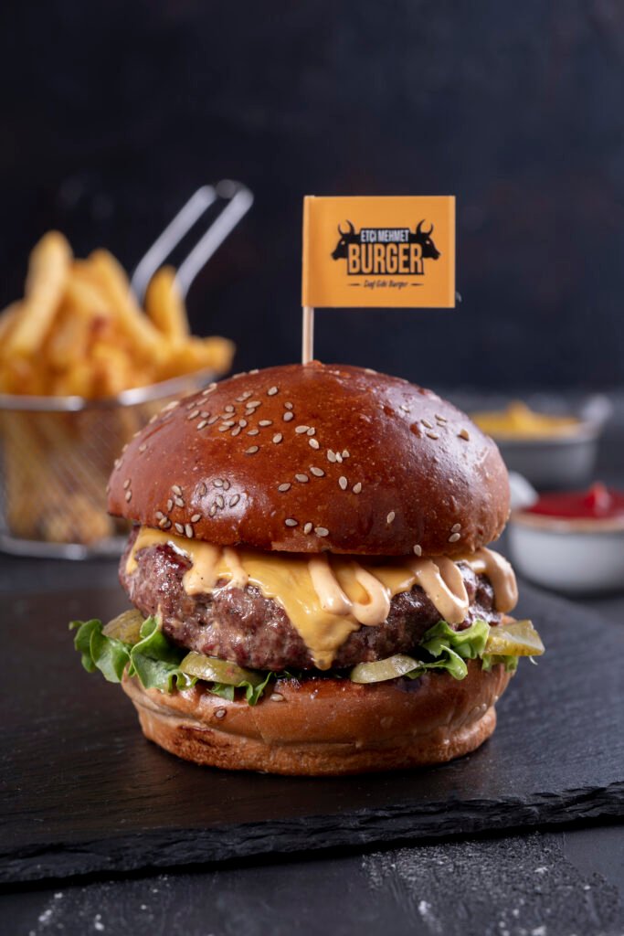 Cheese Burger İçindekiler:Dana burger köftesi, cheddar peyniri, karamelize soğan, turşu,yeşillik, etçi mehmet özel sos ve patates kızartması ile.