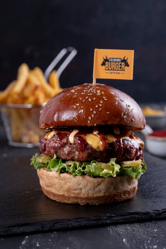 BBQ Burger İçindekiler:Dana burger köftesi, barbekü sos, cheddar peyniri, karamelize soğan, turşu, yeşillik, etçi mehmet özel sos ve patates kızartması ile.