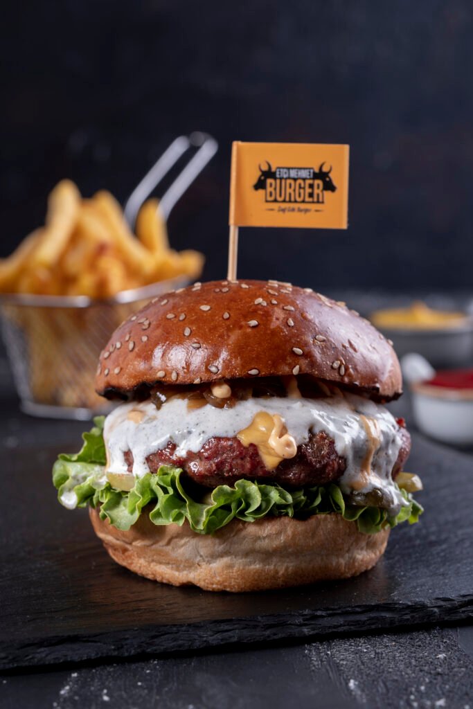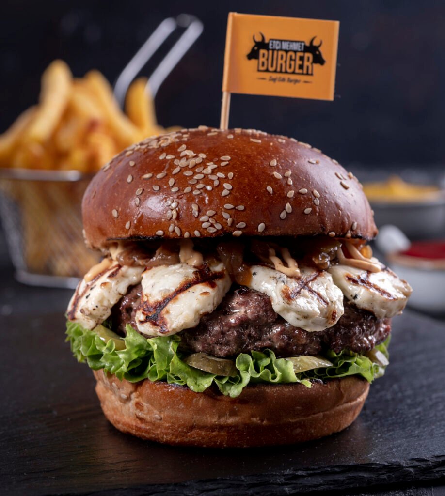 Hellim Burger İçindekiler:Dana burger köftesi, Hellim peyniri, karamelize soğan, turşu, yeşillik,etçi mehmet özel sos ve patates kızartması ile.