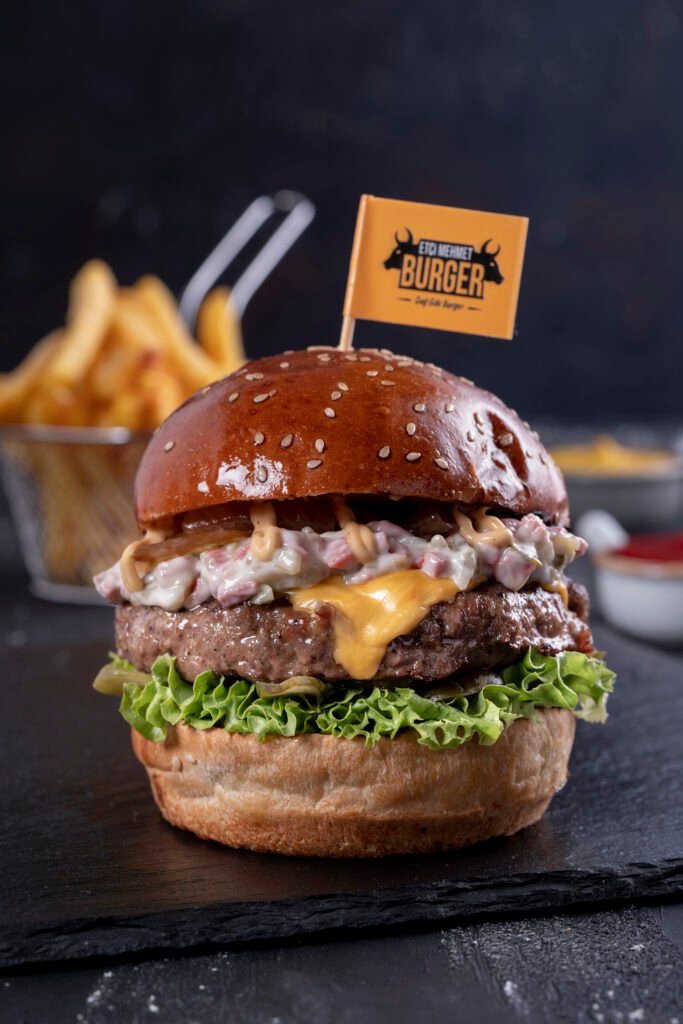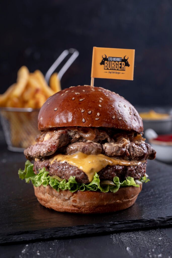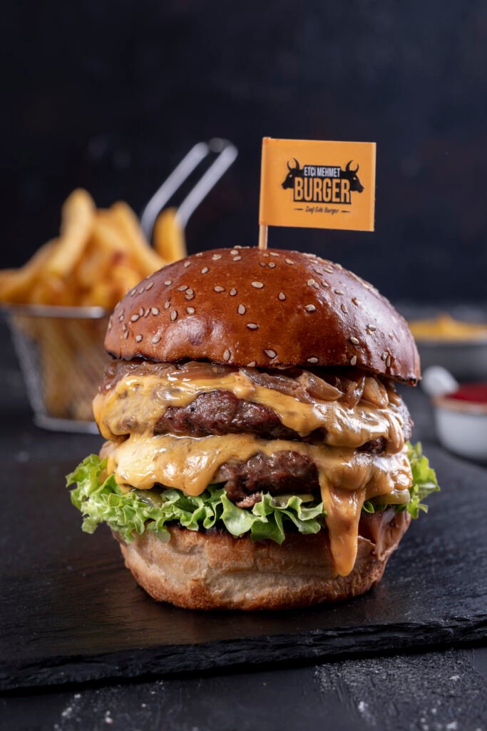 Big Burger İçindekiler:2 Dana burger köftesi, cheddar peyniri, karamelize soğan, turşu,yeşillik, etçi mehmet özel sos ve patates kızartması ile.