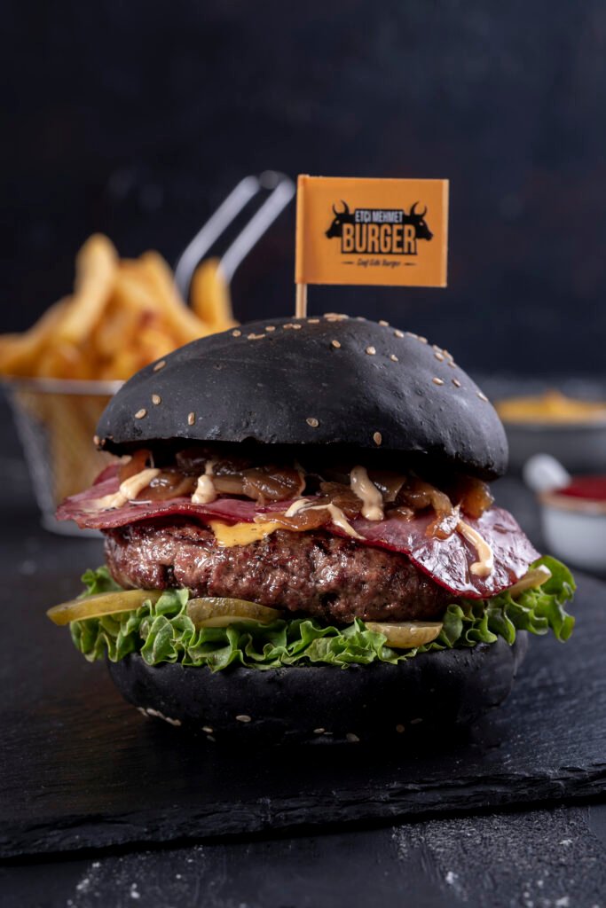 Dark Burger İçindekiler:Özel siyah burger ekmeği, Kömür ateşinde dana burger köftesi, dana füme, cheddar peyniri,karamelize soğan, turşu,yeşillik, etçi mehmet özel sos ve patates kızartması ile.