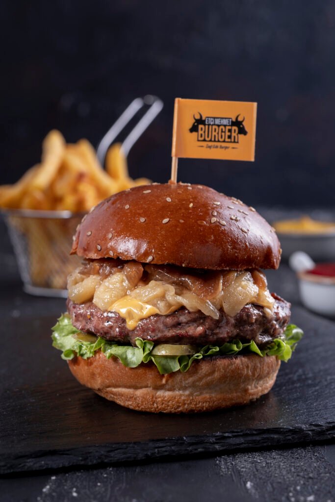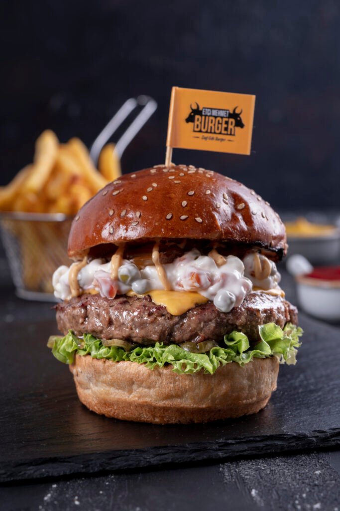 Beğendili Burger İçindekiler:Kömür ateşinde dana burger köftesi, patlıcan beğendi, cheddar peyniri, karamelize soğan, turşu yeşillik,ve patates kızartması ile.