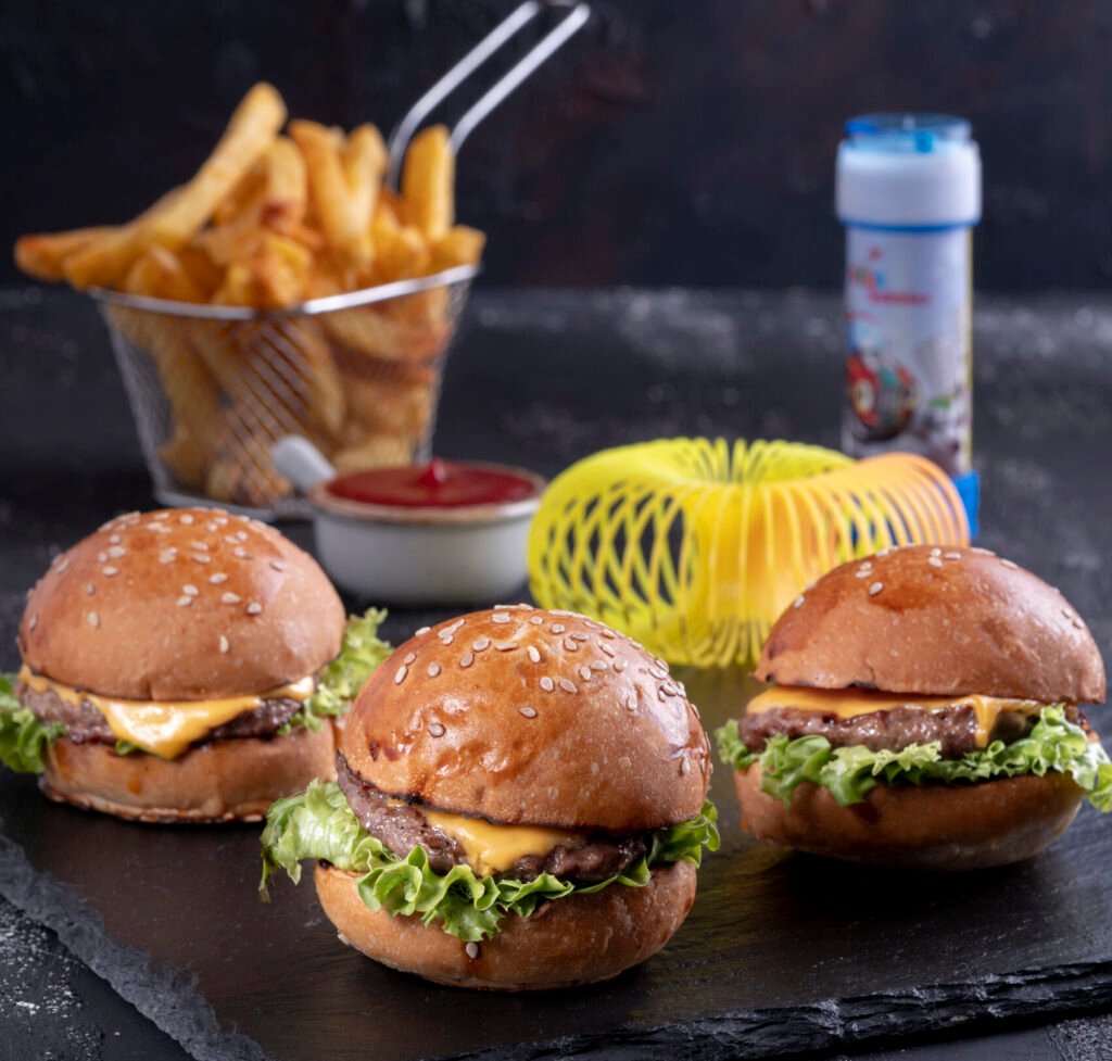 Kids Burger İçindekiler:Mini dana burger köftesi, cheddar peyniri, karamelize soğan, turşu,yeşillik, etçi mehmet özel sos ve patates kızartması ile.