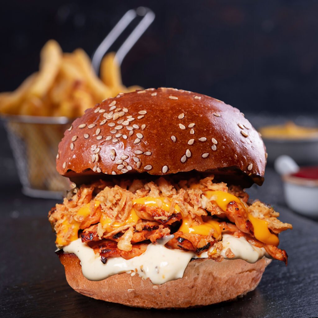 BBQ Chicken Burger İçindekiler:Özel soslar ile marine edilmiş izgara tavuk, barbekü sos, cheddar peyniri, karamelize soğan, turşu,yeşillik, ve patates kızartması ile.