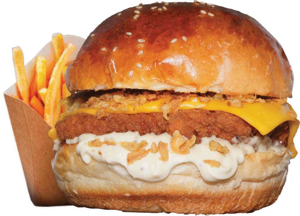 Trüf Mayonezli Çıtır Chicken Burger İçindekiler:Özel Paneli Çıtır Tavuk, Cheddar Peyniri, Trüflü Mayonez, Çıtır Soğan Parçacıkları ve Patates Kızartması ile