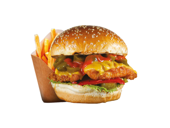Mexican Çıtır Tavuk Burger İçindekiler:Özel Paneli Çıtır Tavuk, Cheddar Peyniri, Kuru Soğan, Turşu, Yeşillik, Etçi Mehmet Özel Sos, Jalapeno Biber, Közlenmiş Kırmızı Biber, Acı Sos ve Patates Kızartması ile