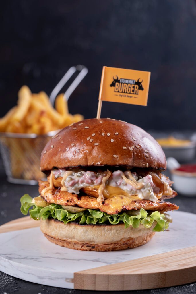 Gozo Chicken Burger İçindekiler:Özel soslar ile marine edilmiş izgara tavuk, İtalyan sos, cheddar peyniri, karamelize soğan, turşu,yeşillik, ve patates kızartması ile.
